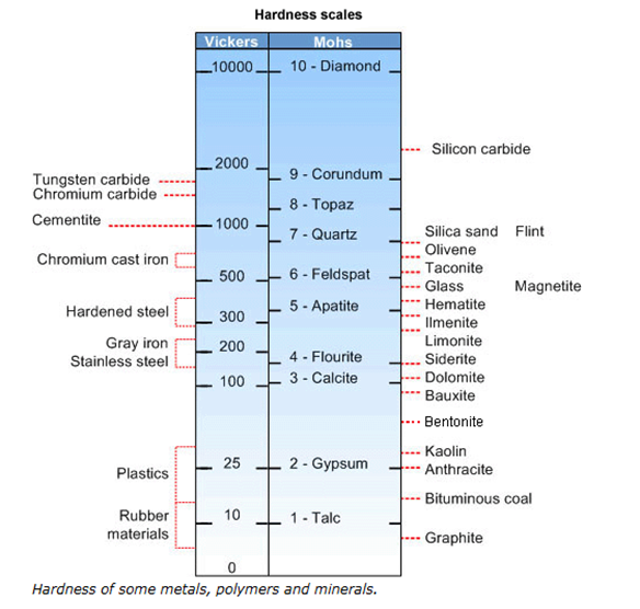 Some metals, such as manganese steels including Hadfield steel, have the ability to work harden. In these materials the structure is not entirely stable, and under repeated wear it transforms into a hardened state, improving wear resistance over time. To compare hardness across different materials and minerals, the Mohs scale is often used. This is a non-linear scale based on the ability of one mineral to scratch another, and provides a practical way of understanding relative wear resistance in pump applications.